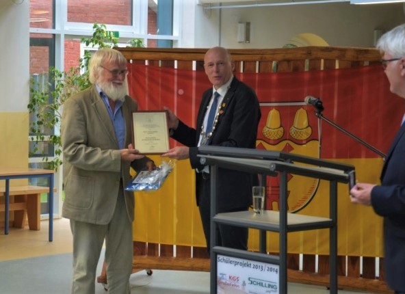Bürgermeister Erwin Adams überreicht Focke Focken (links) die Ehrenmedaille der Gemeinde